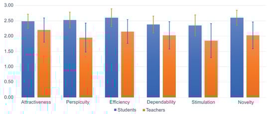 For UEQ scales, averages are usually between and 2; i.e., participants do not tend to rate with extremes [66]. Taking this into account, our results were positive for both groups. As can be seen in Table 1 and Table 2, all averages were greater than or close to 2. In the case of the students, we had better ratings, since the confidence intervals are narrower than those obtained with the teachers. We attribute this to the fact that students have much more experience with software applications of various kinds, so they are more comfortable experimenting with a new system. Qualitatively, we can say that this is consistent with our general observations of the participants: the teachers were much more cautious when performing the test tasks. Nevertheless, both groups yielded consistent data, as all Cronbach’s alpha coefficients were greater than (see Table 3).