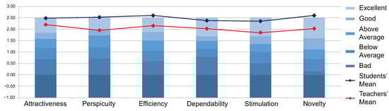 The last aspect that UEQ provides is the benchmark (see Figure 9). We can highlight that the students’ averages appeared in the “Excellent” category in all cases. As for the teachers, it was the same; only the Perspicuity scale was in the “Good” range. Of course, these results are not defined enough, as the context in which all the studies were made is missing. We can only mention the interpretation offered by UEQ; i.e., our scales were in the top 10% range.