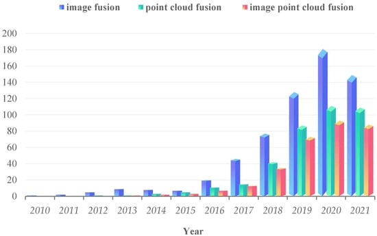 Some breakthroughs have been made in the research of autonomous vehicle multi-sensor fusion methods, including image fusion, point cloud fusion, and image–point cloud fusion [3,16,17,18]. Although a multi-sensor redundant combination design can make up for the insufficiency of a single sensor in perception, reduce the uncertainty of target detection, and enhance the vehicle’s effective perception of surrounding environmental information, the test results in real scenarios are not ideal. For example, the fusion of camera and LiDAR can provide high-resolution image information and reduce the impact of lighting conditions, but the perception effect is still lacking in bad weather and obstacle occlusion. Furthermore, there are still many other problems to be overcome, such as imperfect information fusion methods, large amounts of data, limited network bandwidth, and spatiotemporal alignment problems. Figure 2 depicts the research trends of cooperative perception based on multi-sensor information fusion from 2010 to 2021. The data are from Google Scholar advanced searches of cooperative perception and different sensor fusion methods.