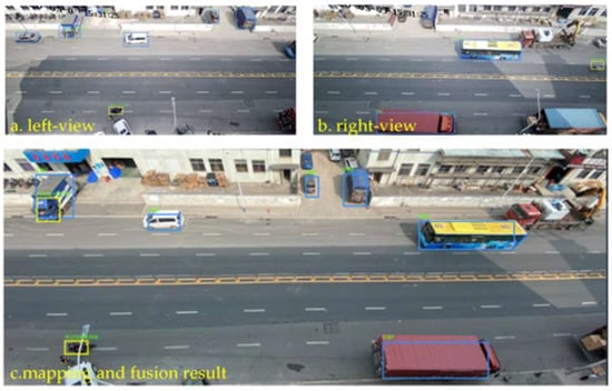 In addition, many scholars have studied the existing image fusion strategies for limitations and blind spots in the perceived field of view and range. Xiao et al. [24] used a deep learning method to extract key information from the vision system and expanded the perception range of the host vehicle by fusing the bird’s-eye view generated by the perception information of other vehicles in the vehicle network. This approach deepened the self-driving vehicle’s ability to understand its environment. Sridhar et al. [25] used cooperative relative positioning and map merging [26] to realize the cooperative perception of vehicles with a common field of view by sharing the image perception information of adjacent vehicles with the host vehicle. Liu et al. [27] used V2V communication technology, based on a 3D inter-vehicle projection model and selected feature point matching to estimate the geometric transformation parameters to achieve inter-vehicle image information fusion through deep-affine transformation. It effectively overcomes the problem of perceived blind spots in traffic jams, but it overlooks the impact of viewing angles, and, in some cases, there will be size deviations. If the perspective issue is taken into account, the scalable 5G multi-access edge computing-driven vehicle infrastructure cooperative system has a broader prospect. Through the distributed data fusion method, the environmental information detected by RSU cameras in multiple areas is interactively and perceptually fused. A global semantic description of the surrounding environment is formed, which greatly improves the perception range and accuracy of the vehicle [15], as shown in Figure 3. At the same time, the system introduces the high concurrency and low latency characteristics of 5G communication technology, which can effectively alleviate the communication load but lacks the evaluation of pose (such as position and direction). Table 2 summarizes the research status of image fusion in cooperative perception.