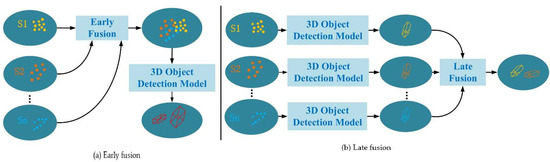 Decision-level fusion refers to extracting the detected objects from each individual sensor and fusing the detection results. The fusion speed is fast and it is more suitable for data sharing, but there are few studies on it at present. Arnold et al. [34] proposed an early fusion (data-level fusion) and late fusion (decision-level fusion) 3D object detection cooperative perception scheme. This scheme adjusts the tradeoff between different fusion methods according to the sensor visibility and detection distance, selecting early fusion for high sensor visibility and short-range detection to ensure the detection effect and reduce the communication cost. On the contrary, if the visibility is poor and the point cloud data at the far position is small, late fusion is selected, and, finally, the two detected 3D bounding boxes are fused and shared, as shown in Figure 4. Experiments show that by fusing LiDAR data from different stages and positions of roadside units, spatial diversity with overlapping fields of view can be fully utilized to increase the density of point clouds, reduce false negative detection, more accurately estimate the bounding boxes of detected objects, and improve object detection accuracy.