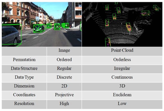 Single-modal multi-sensor data fusion is always limited by intrinsic and extrinsic conditions. For example, the camera has a difficult time detecting the target depth information and is greatly affected by adverse weather and light. LiDAR has poor perception effects, low resolution, and a high cost for long-distance small targets. Millimeter-wave radars have strong antijamming capabilities but low resolution and a limited field of view. This subsection summarizes and analyzes the current sensor data fusion methods and challenges for single-vehicle autonomous driving [35,36] and points out that multimodal and multilevel sensor information fusion can greatly improve the effectiveness of cooperative perception. Figure 5 shows a comparison between image and LiDAR data characteristics.