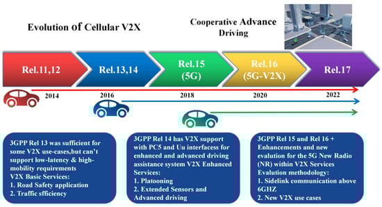C-V2X was standardized by the 3rd Generation Partnership Project (3GPP), which includes long-term evolution (LTE)-V2X and 5G-V2X (NR) technologies and is gradually enhanced through the evolution stages shown in Figure 6 [67,68]. In addition, C-V2X defines a PC5 interface that enables direct V2X communication through the sidelink and a Uu interface that realizes communication between the terminal and base station utilizing the uplink/downlink. It has high network capacity and wide coverage and can better support autonomous driving cooperative perception in the IoV environment, improve the reliability of data transmission, decrease transmission delay, and reduce frequent horizontal switching in the network. C-V2X offers performance advantages over DSRC in terms of its additional link budget, higher resilience to interference, and better non-line-of-sight (NLoS) capabilities [69]. Based on [65], Choi et al. [70] further analyzed this concept based on DSRC and 4G cellular networks, which are not enough to support the large-scale sharing of raw sensor data. Three types of vehicle networks, including 5G cellular, a modified version of IEEE 802.11ad, and a dedicated new standard, were proposed. In addition, it was pointed out that these three communication methods can effectively avoid the channel congestion problem caused by a large amount of data transmission. On the other hand, they can improve the real-time performance of the vehicle networking perception system. At present, C-V2X is in the actual deployment and application test stage, and the system is gradually improving. The latest release of New Radio (NR) V2X was specified in Release 16 (Rel-16) as a complementary access technology defined to better serve sophisticated applications and use cases with more stringent requirements (e.g., platooning, advanced driving, etc.). Meanwhile, the standardization and testing work of Rel-17 is actively promoted [71].