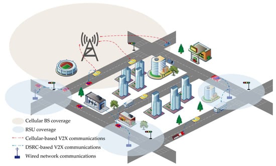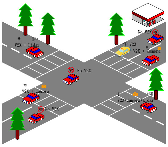 The Society of Automotive Engineers (SAE) introduced the J3016 “Levels of Driving Automation” standard for consumers. The J3016 standard defines the six distinct levels of driving automation, including level 0 (no driving automation), level 1 (driver assistance), level 2 (partial driving automation), level 3 (conditional driving automation), level 4 (high driving automation), and level 5 (full driving automation) [2]. With the continuous development of autonomous vehicle sensor technology, it now plays a critical role in improving the sensing range and accuracy of autonomous vehicles, as well as ensuring that essential information required by autonomous vehicles while driving, including traffic signs, road information, obstacle information, and so on, is available [3,4]. However, autonomous vehicles above level 3 require continuous, real-time situational awareness of the surrounding environment [5], which is difficult to achieve by only relying on the perceptual ability of the vehicle itself for the following reasons: