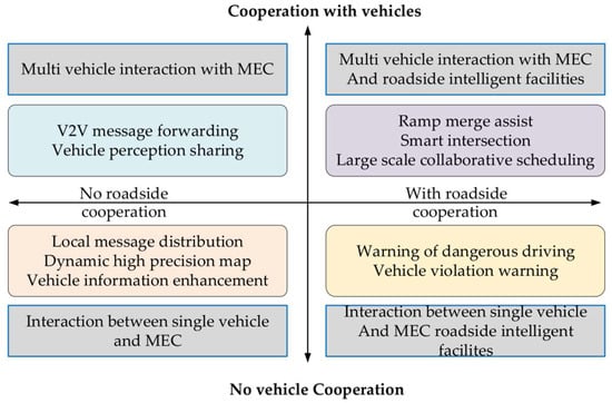 In practical application scenarios, to solve the problems of high network transmission latency and reduced reliability in cases of highspeed vehicle driving, Zhu et al. [76] proposed a 5G C-V2X intelligent fusion network technology based on MEC, and they discussed and summarized the network architecture, deployment schemes, and application scenarios. As shown in Figure 8, according to the needs of vehicle–infrastructure collaboration, the application scenarios of the intelligent fusion network are divided into four categories: interaction between a single vehicle and the MEC; interaction between multiple vehicles and the MEC; interaction between a single vehicle and the MEC or roadside intelligent facilities; and multivehicle interaction with the MEC or roadside smart facilities. In addition, the integrated network architecture of MEC and C-V2X effectively shortens the transmission path of data services in the IoV environment with localized services and realizes the information exchange delay to meet the service requirements of ultra-high reliability and low latency in the C-V2X scenario. In addition, the differences in the driving speeds of autonomous vehicles also require different performance requirements for network communication. When the vehicle speed is too high, it will pose higher challenges to edge node sensing data, computing resource allocation, and task scheduling. Fukatsu et al. [77] pointed out the importance of using millimeter-wave communication in cooperative perception in combination with the requirements of autonomous vehicles for network data transmission at different driving speeds. As the speed of the vehicle increases, the data rate generated by the sensor increases exponentially, and they pointed out that, when using V2V millimeter wave communication on the 60 GHz band, the cooperative perception of overtaking scenarios can still be achieved when the speed exceeds 51 km/h. Fukatsu et al. [78] studied the sensor rate required for cooperative perception to achieve specific application functions for urban road scenes, and they found that millimeter-wave communication showed better performance in realizing the cooperative perception of edge nodes. It was verified that, when vehicle speeds are 56 km/h and 47 km/h, the required data rates are 12 GHz and 6 GHz, respectively.
