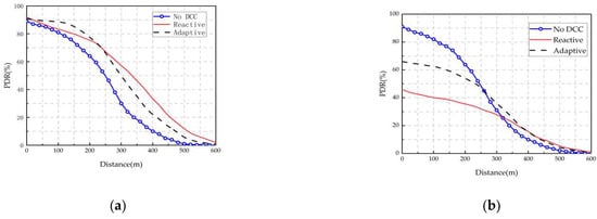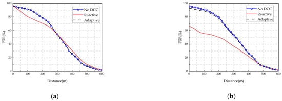 Sepulcre et al. [113] first explored the impact of packet rate-degraded congestion control protocols on the application-level performance of vehicular networks. The results show that the method of controlling vehicle packet loss can reduce the flow of data packets transmitted to the wireless channel and improve communication performance. However, dropped packets are not transmitted, resulting in the reduced performance of the application and a negative impact on the co-awareness effect. As shown in Figure 10 and Figure 11, the radio performance and application-level performance are analyzed for the PLR at traffic densities of 120 veh/km and 180 veh/km, respectively. If the DCC mechanism is not used, both reactive and adaptive methods can improve radio performance, but the application-level performance decreases. The main reason is that application-level packets are not discarded by DCC, as shown in Figure 10. At a traffic density of 120 veh/km, the radio performance is hardly affected, and the application-level performance still drops a large number of packets due to the reactive method, resulting in application-level performance degradation. Furthermore, there is no benefit to using DCC for the application-level evaluation of the packet delivery ratio (PDR) at medium and low traffic densities, as shown in Figure 11.