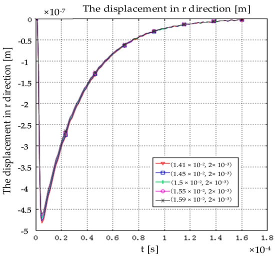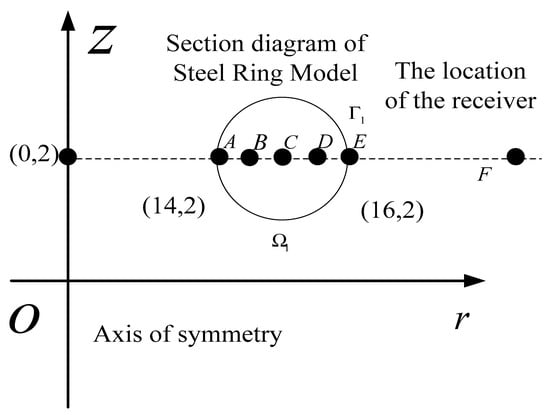 As shown in Figure 2, in coordinate system , the coordinate of the central point of the steel ring is and the coordinate of the center of its meridian plane is . The solution of the multi physical field problem is divided into two areas: the electromagnetic field solution area covers the model to be imaged to obtain the electromagnetic field information in the model; in the solid vibration solution area, only the model to be imaged is solved to obtain the particle displacement. Three problems are analyzed in the simulation analysis; the first is the vibration of internal particles in the steel ring model. The second is the vibration characteristics of the sound source, and the third is the distribution characteristics of the sound source. Therefore, five inspection points on the circular section of the steel ring are selected from the inside to the outside: , , , , , as shown in Figure 2. In Figure 3, Figure 4, Figure 5, Figure 6 and Figure 7, the electromagnetic field data and particle vibration data detected at these five different positions are represented by ““ icons, respectively.