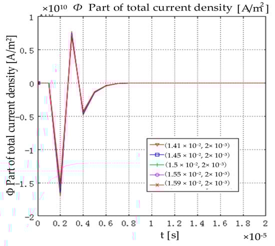 When a current signal with a pulse width of is injected into the two-dimensional axisymmetric model, the total current density distribution of each point in the model is shown in Figure 3. Under the action of the rising edge of the applied current signal, the current density in the model first generates a pulse in the opposite direction. Due to the narrow pulse width of the excitation electric signal, under the action of the falling edge of the applied current signal, the current density waveform in the model then generates a forward pulse. Then, it is returned to 0 after vibration; the amplitude difference of the current density waveform of each point in the model is very small. It can be considered that the change in the current density of each point in the model with time is the same. That is, in the injection current magnetoacoustic imaging, the change of the current density of each point in the model with time is synchronous.