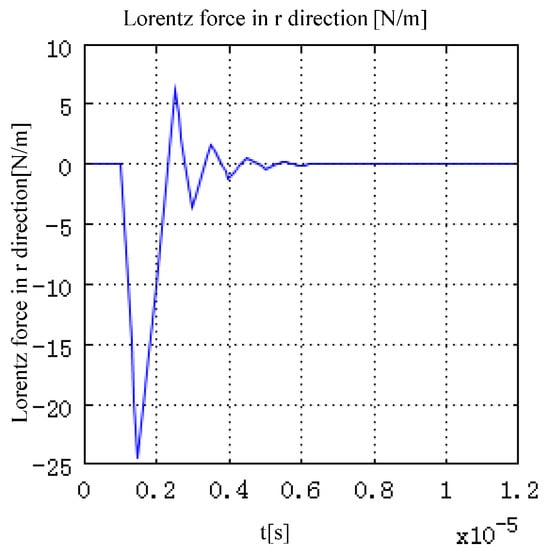 As is shown in Figure 5, since the magnetic field is along the direction , the Lorentz force in the direction in the model is far less than that in the direction , which is almost negligible. It can also be seen that when the pulse width of the excitation current is , the pulse width of the Lorentz force waveform in the direction inside the model is . When the excitation current density is , the Lorentz force in the model is approximately a function of .