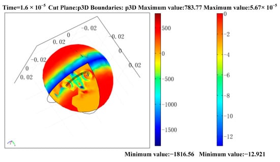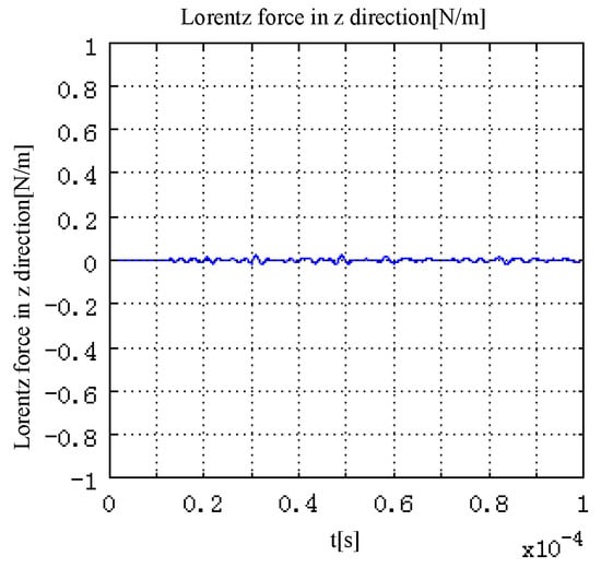 The values of Lorentz force generated by electromagnetic field interaction in directions and z are shown in Figure 4 and Figure 5. The time characteristic of the excitation pulse determines the time characteristic of the Lorentz force generated in the model. As shown in Figure 4, with the change in the current density in the model, the Lorentz force in direction in the model first increases along the negative direction of . After reaching the peak value, the peak value gradually decreases, and then increases along the positive direction of . Finally, it returns to 0. The change in the 1 direction of the Lorentz force corresponds to the change in the total current density in the model.