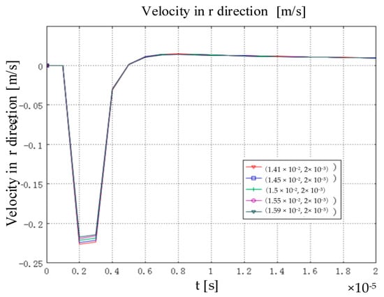 The particles in the rail will produce vibration and displacement under the action of Lorentz force. The following are the time characteristics of vibration velocity and displacement of particles in the model in different directions. Figure 6 shows the time characteristics of particle vibration velocity along the direction of particle in the steel ring. The vibration velocity difference of particles along the direction at the five groups of detection points is very small. The maximum vibration velocity of the particle along the direction is . In the process of one vibration, the vibration velocity of particle increases first, then decreases along , and finally returns to zero.