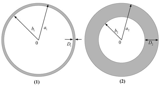 The ring model and the disc model as shown in Figure 10 are built to simulate the magnetoacoustic signal. (1) is ring model and (2) is the disk model. The outer radius of the ring model is , and the inner radius is ; The outer radius of the disc model is , and the inner radius is ; The sampling radius of the signal is .
