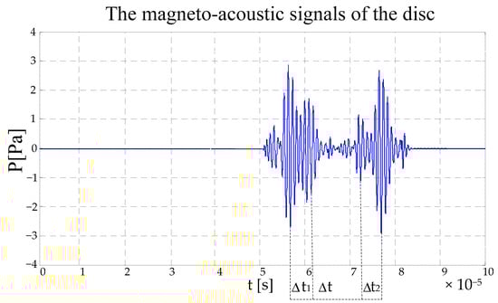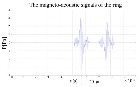 In Figure 12, there are two sound waves. The relative times of the pulses in the sound waves are calculated; from the calculation results, it can be seen that the position of sound pulse is corresponding to the position of the ring boundary. The width of the sound wave string corresponds to the propagation time of the sound wave in the disc. In Figure 12, there is no sound wave in the corresponding part of time, which corresponds to the propagation time of the sound wave in the middle part of the disc. Because of the close distance between the inner and outer boundaries of the disc, the magnetoacoustic signals are superimposed, which is determined by the shock function of the ultrasonic transducer system.