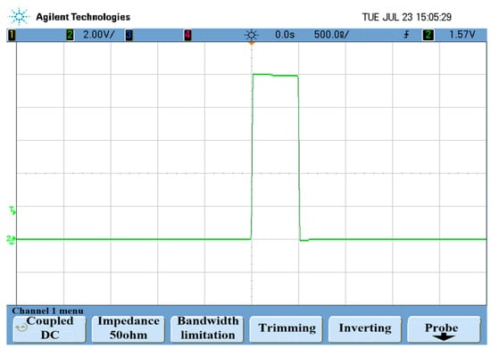 In order to further verify the rationality and feasibility of the method, a high-speed rail defect magnetic acoustic detection platform is designed, the structure of which is shown in Figure 13. The system includes signal excitation system, signal receiving system and acquisition system. The pulse generator sends out a Pulse Electric Signal, which is amplified by the amplifier and loaded on the steel ring. The signal scanning system is synchronously triggered to receive the magnetic sound signal, the received magneto-acoustic signal is collected and processed after passing through the signal detection circuit. The excitation signal is a pulse wave with the waveform shown in Figure 14.