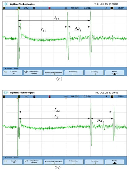 When the sampling radius of the receiver is , the time for the first waveform on the oscilloscope in Figure 15a is about ; that is, the time for the first boundary of the model to propagate to the transducer; the time for the first waveform is about , the delay time between the two waveforms is , which corresponds to the propagation time of the magnetic acoustic signal between the two boundaries of the model. As the sampling radius of the receiver increases, the delay time of both waveforms increases. As shown in Figure 15b, the delay time corresponds to the increase of the sampling radius, and the delay time between the two signals remains .