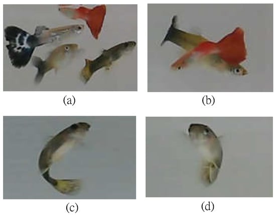 Specifically, we consider an aquarium space L with length (l), width (w), and height (h) in cm. We assume that N guppies swim freely in the aquarium space L, where each fish has its own ID (i.e., name), denoted by IDi, i = 1…N. Here, we consider the most common physiological states of guppies [19], including healthy (marked as H), diseased (rotten tail, marked as R), and dead (marked as D). In addition, we also consider fish swimming behaviors, including group swimming, shading with each other, flipping body, and turning over for breath, among others, as shown in Figure 2.