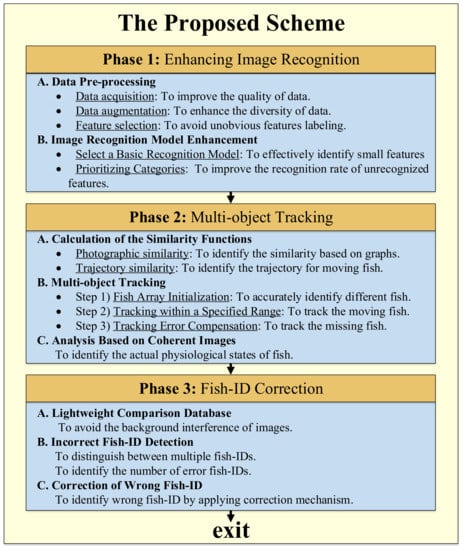To precisely detect the fish physiological states, we propose a practical scheme including three phases, as shown in Figure 3. The first phase is to perform data pre-processing, including data acquisition, data augmentation, and feature selection, to obtain high-quality training data. In addition, we select and enhance an image recognition model to improve the detection accuracy based on the prioritizing rules, especially for the small-scale features. The second phase is to design a multi-object tracking mechanism based on the calculation of similarity functions according to the fish’s photograph and trajectory, and then analyze the tracked fish over consecutive frames to determine their actual physiological states to improve recognition accuracy. The third phase is to develop a fish-ID correction mechanism. We build a comparison lightweight database for fish images based on the histogram coincidence to estimate when to trigger the correction mechanism and dynamically perform correction. The detailed steps are depicted as follows.