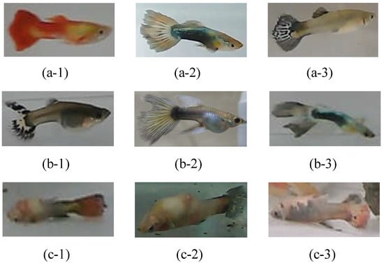 - Data acquisition: We collected more than 6000 pictures of guppies, including three physiological states: health, disease (rotten tail), and death, as shown in Figure 4. These pictures are obtained from (1) online guppy photos and (2) the real guppy photographed by the visual sensors (cameras). Note that the online guppy photos are from Taiwan Fish Database [20], Guppy Dataset [21], and other searching engine results; the real guppy pictures are photographed by the visual sensors with a pixel resolution of 4032 × 3024 and 5184 × 3880, respectively. The characteristics of the guppy pictures include their various appearances, such as front view, back view, side view, swimming up, and swimming down, under the environments of clear background and background with landscaping.