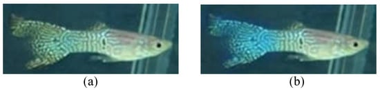 - Data augmentation: To improve the overall data diversity, we randomly select photos to process with discoloration, rotation, or mirroring to increase the amount of training data, which can make the recognition model more general and avoid overfitting [8,22,23]. As the images of fish with certain features may not be easy to obtain (such as rotten tails), we also dye the existing rotten-tail images with random colors, such as blue, green, purple, red, and black colors, which are the common colors of guppy tails, in order to balance the data of the three physiological states, as shown in Figure 5. This can potentially improve the recognition capability.