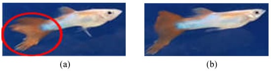 - Feature selection: According to the literature [24,25], the caudal fin of rotten-tail fish will have irregular notches or a jagged appearance. Thus, we label these features according to the above description and consult the experts working in the aquarium for guidance [26]. Sometimes, it is difficult to judge because of the irregular swimming of the fish and the angle of view, as shown in Figure 6. Therefore, we only can label the feature of the images that meet the above description, so as to avoid labeling with inconspicuous characteristics of rotten tails. Note that if the images of fish with inconspicuous features are used as training data, the tails of healthy fish are easily misidentified as rotten-tail fish, potentially resulting in a decrease in the recognition rate.
