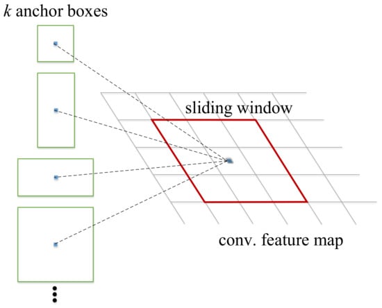 - Then, the RPN layer generates candidate boxes (region of interest, RoI). This layer replaces the selective search used by the previous versions of R-CNN and faster R-CNN to extract candidate boxes, and leverages the concept of anchor boxes by the operation of sliding window on the feature map. The position of the center point of the current sliding window corresponds to the pixel space of the original image, and then k anchor boxes with different sizes and different aspect ratios are generated on the original image. The size of each anchor box will vary according to the size of the input image, as shown in Figure 8. Finally, it estimates whether the anchor boxes belong to the target (positive) or not (negative) through the softmax function, and then uses the bounding box regression to adjust the position information of the anchor boxes to obtain the accurate position of candidate frames.