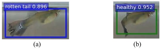 Figure 9. Fish flips over would easily lead to misidentification: (a) a rotten-tail fish and (b) misidentified as a healthy fish when turning around. - Next, let the threshold of the health category be , the threshold of the diseased (rotten-tail) category be , and the threshold of the death category be . Then, according to the above priority, when the confidence value of the category is greater than the corresponding threshold (e.g., , , ), it will be determined as the corresponding category.