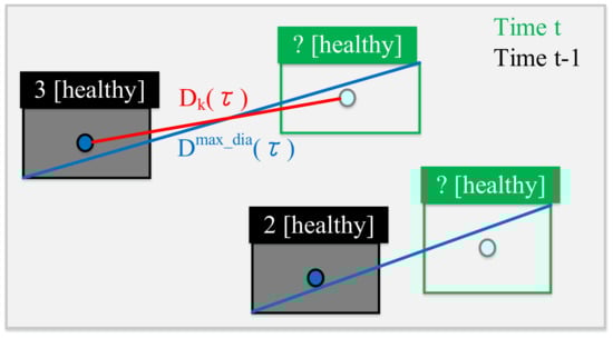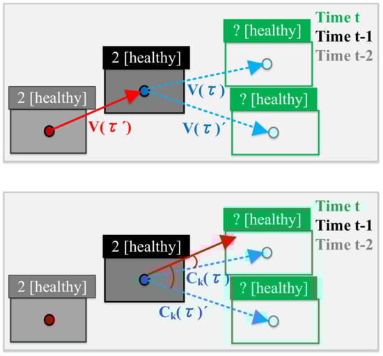 Note that τ’ represents the time before the previous moment (t – 2) and the previous moment (t − 1), so and are the moving vectors of previous moment and the current moment, i.e., and , respectively. This can be illustrated in Figure 11.