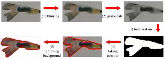 - Establishment of a Lightweight Comparison Database: According to the ID within frames after the system starts, each fish is intercepted in λ valid images and added to the fish comparison database. Then, we expand these images through mirroring and flipping [8]. After that, we have 2λ images for each fish-ID i, denoted by Q(i). Here, to avoid the background interference of fish images, we perform the following image processing processes [32], including (1) blurring, (2) gray-scale, (3) binarization (black and white), (4) taking contours, (5) removing background, and then storing the images in Q(i), as illustrated in Figure 12. In this way, the interference caused by the background can be effectively reduced.