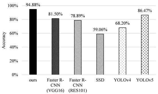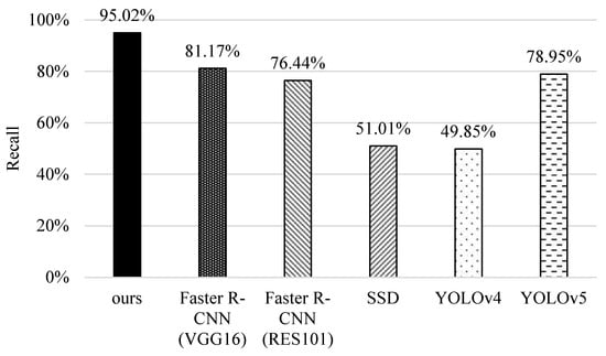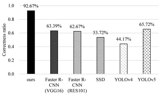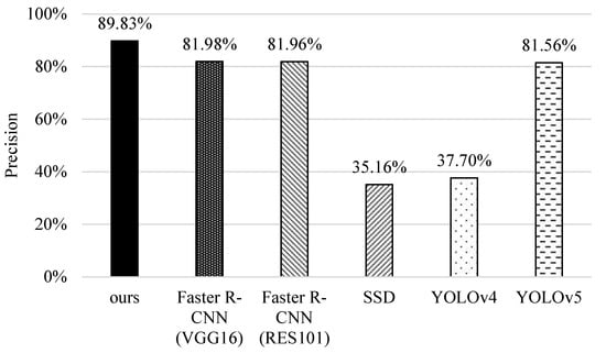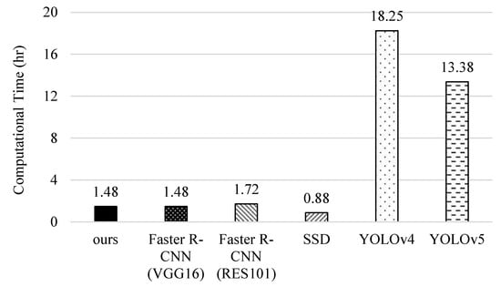 Finally, we compare the computational complexity of different methods. The computation time for data training is measured by the platform of ASUS D320MT with Intel Core i5-6400 CPU@ 2.7GHz, 8GB RAM, and NVIDIA GeForce® RTX 2080 8GB Graphic Card (Intel and Nvidia, Santa Clara, CA, USA). In Figure 18, we can see that YOLOv4 takes the longest time because its networks are more complicated and it needs to use a proper batch-size to improve recognition accuracy. Contrarily, YOLOv5 resizes the network model and improves the estimation process to reduce the training time. For the original faster R-CNNs, RES101 takes more time than VGG16 because it performs a pooling operation after the first convolutional layer. Although our scheme needs more time than SSD, it can achieve higher precision, recall, F1-score, accuracy, and correctness ratio (referring to Figure 13, Figure 14, Figure 15, Figure 16 and Figure 17).