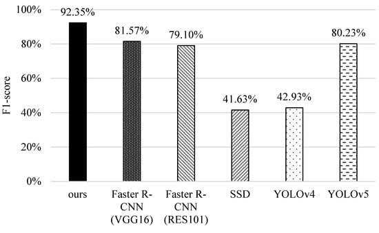 Furthermore, we compare the F1-score of different schemes in Figure 15. Similarly, SSD and YOLOv4 have lower F1-score values owing to their misidentification of small features. YOLOv5 performs better because it enhances the input layer with data argumentation, thus improving the identification capability. The original faster R-CNNs are better because of their recognition ability of small objects. It is worth noting that the proposed scheme outperforms other schemes. The reason is that it enhances the original faster R-CNN based on the prioritizing classification with proper confidence thresholds, and combines image recognition with tracking concepts to estimate the results by coherent images; thus, it has better performance in terms of F1-score.