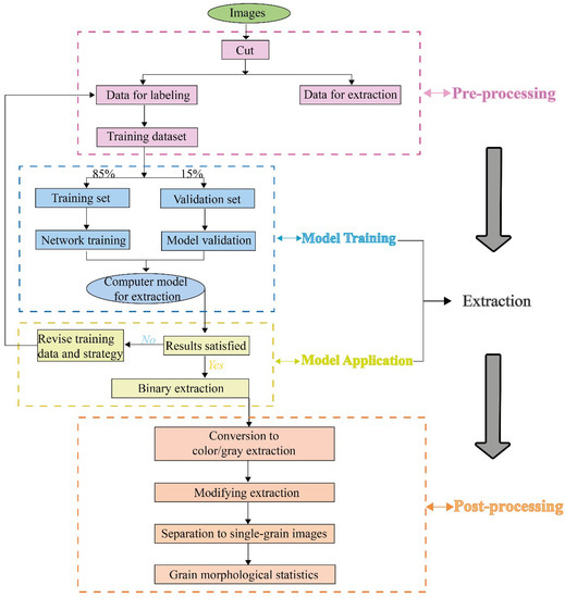 The extraction consists of two sub-steps: training an extraction model and then applying this model to extract grains from the matrix by images. The core method is the U-Net algorithm in model training, which applies to general pixel-classification tasks in images with one or multiple channels.