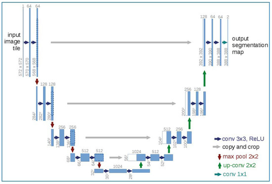 As a kind of fully convolutional network (FCNs), U-Net inherits this characteristic of supplementing a usual contracting network by successive layers, where pooling operators are replaced by upsampling operators to increase the resolution of the output [41,44]. The main modification of U-Net, based on FCNs, is the large number of feature channels in the upsampling part that allows the network to propagate context information to higher resolution layers. Figure 2 shows the architecture of U-Net. A contracting path (left side) and an expansive path (right side) give the u-shaped architecture. The contracting path follows the typical architecture of a convolutional network and the expansive path combines the feature and spatial information through a sequence of upconvolutions and resolution features from the contracting path [43,45].