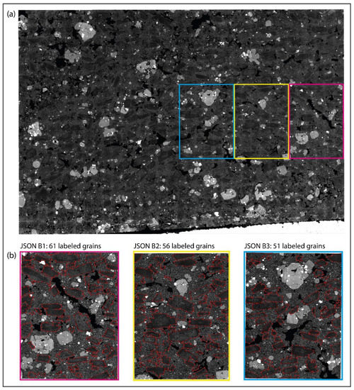 During pre-processing, we make equal-sized cuts for the three images, respectively, and select a few pieces to label the shapes of grains (Figure 4b, Figure 5b and Figure 6b) in Labelme to prepare for the training model in extraction. As a result, there are three JSON files, respectively, for BSE, OFSD, and SAND.