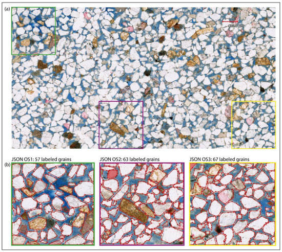 (a) The transmitted light microphotograph of offshore sandstone thin section. (b) Three JSON files with 57, 63, and 67 labeled grains. The JSON file with the green edge, purple edge, and yellow edge corresponding to the place circled by the green, purple, and yellow rectangles in (a).