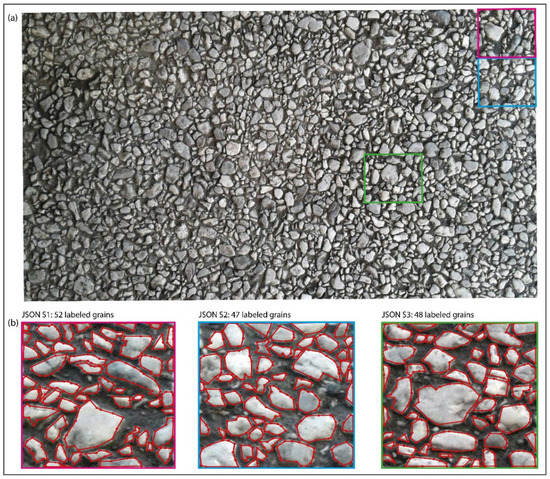 (a) The photograph of sandstone outcrop. (b) Three JSON files with 52, 47, and 48 labeled gravel grains. The JSON file with the pink edge, sky blue edge, and green edge corresponding to the place circled by the pink, sky blue, and green rectangles in (a).