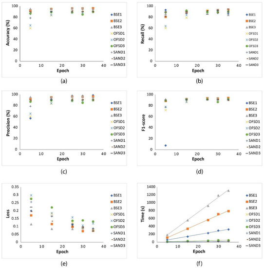(a) The changes of accuracy as the epoch varies from 5 to 35 for the nine groups of BSE1, BSE2, BSE3, OFSD1, OFSD2, OFSD3, SAND1, SAND2, and SAND3. (b) The change of recall as the epoch varies from 5 to 35 for the nine groups. (c) The change of precision as the epoch varies from 5 to 35 for the nine groups. (d) The changes of F1-score as the epoch varies from 5 to 35 for the nine groups. (e) The changes of loss as the epoch varies from 5 to 35 for the six groups. (f) Time of training changes vs. epoch changes for the nine groups.