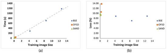 Figure 7 shows how epoch correlates with five performance metrics and training time under different sample numbers and image sizes for BSE, OFSD, and SAND. Generally, Figure 7a–d show that accuracy, precision, recall, and F1-score become relatively stable after an epoch of 20; Figure 7e shows loss is stable after an epoch of 30; Figure 7f shows that time of training is linearly correlated with epoch.