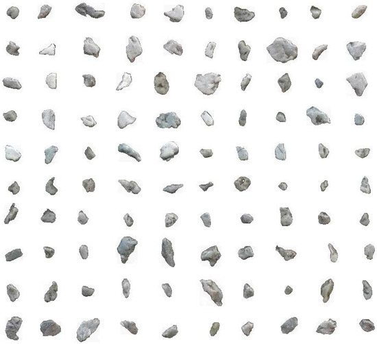 A total of 100 examples of a total of 1311 single-grain images segmented from the modified image of Figure 9b.
