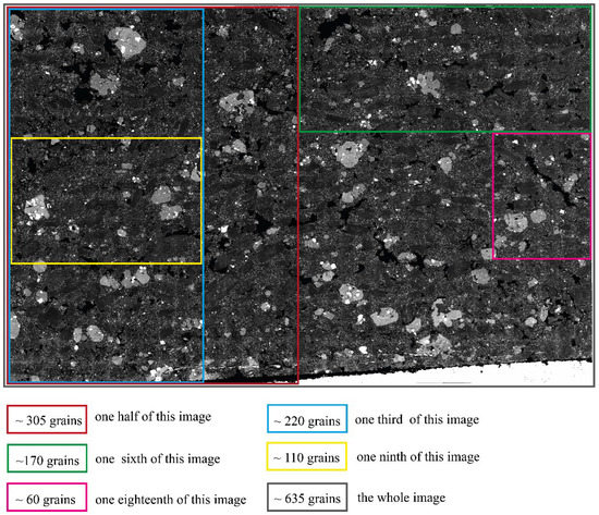 CEmin is just for the processing of grayscale images, whereas UNetGE can process not only the grayscale ones but also the colored ones. Therefore, we take the BSE group that is grayscale (Figure 4) for the comparison of performances between CEmin and UNetGE. We equidimensionally cut the BSE image of plagioclase by five ways; thus, there are five different sizes as shown in Figure 11. The pink rectangle piece in Figure 11 is the same as JSON B1 in Figure 4 that is one-eighteenth part of this image; the yellow rectangle piece is one-ninth part of this image; the green rectangle piece is one-sixth part of this image; the blue rectangle piece is one-third part of this image; the red rectangle piece is one-second part of this image; the whole image is rectangle in grey.