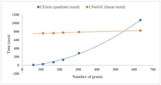 From Table 4, as well as Table 2, it shows that the time to extract grains by CEmin is mainly determined directly by time for extraction, whereas the time to do that by UNetGE is mainly determined by both labeling grains and training models, and the time for model application (a few seconds to over one minute) almost contributes little. Figure 12 is a plot of the numbers of extracted grains vs. the time to extract grains, which shows a quadratic increasement of time with the increasing number of grains using CEmin, and a slow-slope but large-intercept (including 10 min to label grains and 4.9 min to train models) linear increasement of time with the increasing number of grains using UNetGE. Furthermore, Figure 12 shows that with the number of grains over 550, the time by UNetGE to extract grains becomes increasingly advantageous compared with CEmin, and CEmin prefers to extract grains with an amount of less than 500.