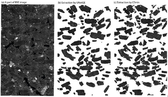 Figure 13 shows a contrast of the direct grayscale extraction of the BSE microphotograph between CEmin and UNetGE and a contrast of the two extractions with the original BSE part. From the perspective of grain shape, the grains extracted by UNetGE have smoother outlines than those extracted by CEmin. Furthermore, the performance metrics of extraction by CEmin in term of “precision”, “recall”, and “F1-score” are, respectively, 93.67%, 96%, and 94.82%, which are compared with extraction by UNetGE based on the BSE1 model (97.36%, 87.84%, and 92.36% as shown in Table 2). Generally, although the performance metrics by CEmin are a bit better than those by UNetGE, we still consider that such a difference of metrics cannot produce substantial influences on the extraction performances. However, the more excellent the shape of grains extracted by UNetGE is the more important for the output, because it would save the time of post-processing (e.g., the manual modification of grain shape).