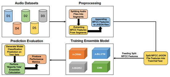Overall, from the inspection of the aforementioned model architectures in Table 5, Table 6, Table 7 and Table 8, various state-of-the-art deep learning techniques have been incorporated in the proposed base networks. Each of the four models adopts separate unique neural network implementations, with the main components, i.e., LSTM, GRU, and CNN layers, all showing increasing promise in recent literature for audio classification proficiency. We subsequently introduce the construction of the ensemble model for audio classification.