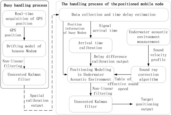 A location method based on spatial-temporal self-calibration for UANS is proposed in this paper and the working principle of the system is shown in Figure 2. In the figure, the buoy handling process is on the left and the mobile node handling process is on the right. The dashed arrow represents transmission through the underwater acoustic channel. Firstly, the buoy receives the GPS position and depth sensor information in real-time. Due to the influence of ocean currents, there is a deviation between the GPS position and the modem position. The system uses the GPS position as observations and uses the modem position and velocity as the state variables to construct a drifting model of the buoy to calibrate the spatial position of the modem. The calibrated position information is sent to the mobile node through a location signal. Next, the positioned mobile node collects location signals periodically transmitted by multiple buoy nodes and estimates their arrival time. Since the mobile node receives the location signals of multiple buoy nodes at different locations, the arrival time error of positioning signals will become larger. The system performs the arrival time calibration processing to calibrate the arrival time of the received signal. Finally, the mobile node takes the arrival time difference of each beacon positioning signal as observation variables and its position as state variables, combined with the sound ray correction, and constructs a positioning model to calculate its position in real-time.