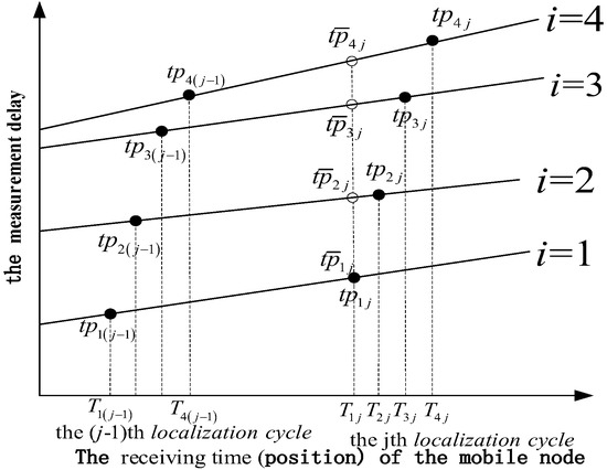 Under the asynchronous system shown in Figure 1, considering the th beacon and the th localization cycle, the th beacon sends a location signal at the instant , where is the cycle period of the system, and the mobile node receives the signal at the receiving instant , where and are the clock skew and offset, respectively, of the mobile node with respect to beacons and is the real propagation delay. We define as the measurement delay at the mobile node position corresponding to the receiving instant . We use the measurement delay values of two consecutive cycles to construct a linear relationship. As shown in Figure 4, the eight solid points () correspond to the measured values of two consecutive positioning cycles . The four curves correspond to four linear relationships established by the mobile node position and the measurement delay. According to these relations, we can interpolate the measurement delay of the mobile node at any position.