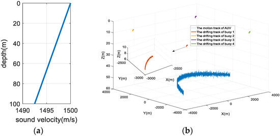 Simulation conditions. (a) The simulated sound velocity profile; (b) the floating trajectory of the buoy and the motion trajectory of the underwater mobile node.