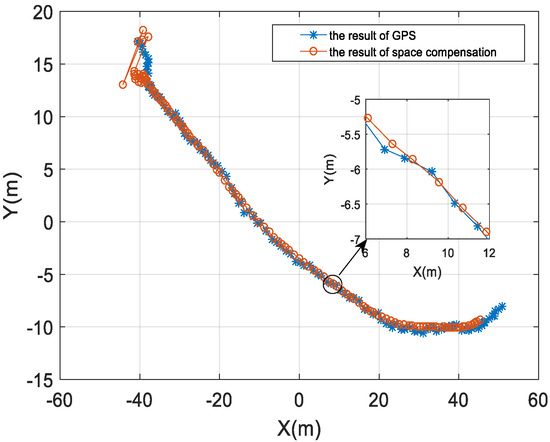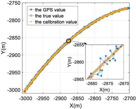 Figure 6 is the result of the modem position of buoy 1. The blue line with * is the GPS direct measurement result, the red line with o is the real position of the modem of buoy 1, and the yellow belt + line corresponds to the result after the space position calibration of Section 3.1 is performed. It can be seen from Figure 6 that the position of the modem obtained after the spatial position calibration is close to the true position while the GPS direct measurement result has a large deviation from the real position of the modem. The corresponding root mean square (RMS) values at different coordinates are used to evaluate the performance of the GPS value and the calibrated value: