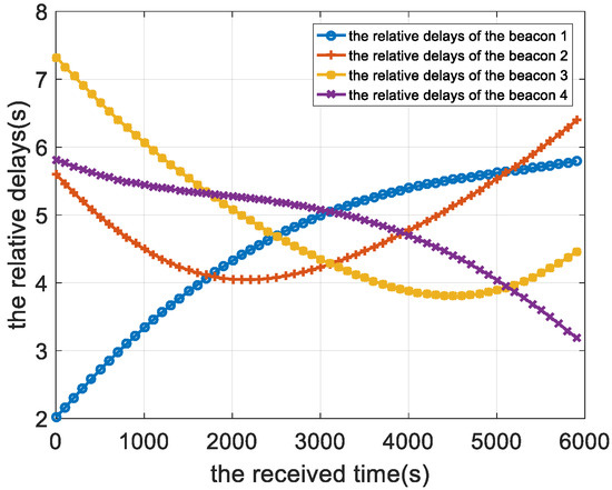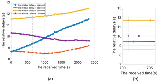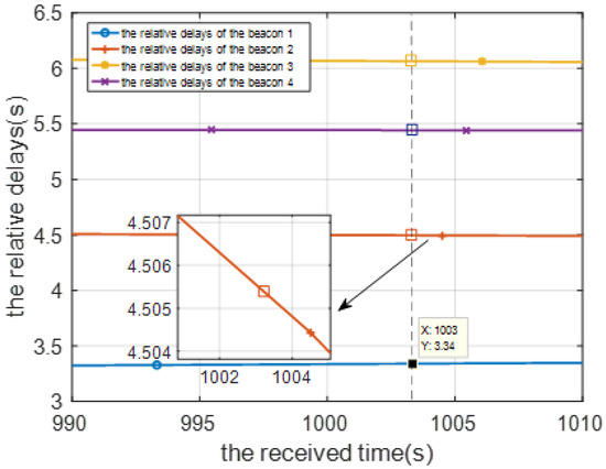 The time delay calibration results of the positioning signal are shown from Figure 8, Figure 9 and Figure 10. Figure 8 is the relative measurement delay result of the underwater mobile node receiving the positioning signal of each buoy in the whole simulation process. Figure 9 is an enlarged result of Figure 8 around 1000 s, and the four points corresponding to the dotted line are the relative measurement delay obtained after using the motion compensation algorithm in Section 3.2. The measurement delay of the positioning signals is compensated by the corresponding position of AUV at 1003 s.