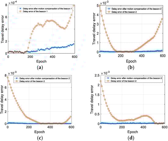 Analysis of the measurement delay error. (a) The delay error of the buoy 1; (b) the delay error of the buoy 2; (c) the delay error of the buoy 3; (d) the delay error of the buoy 4.