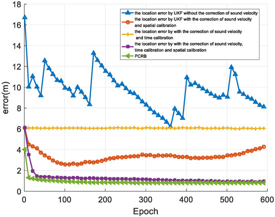 It can be seen that with the use of the sound ray correction, spatial calibration, and time calibration algorithms, the positioning error of the mobile node can be reduced. After sound ray correction and spatial-temporal self-calibration, the proposed underwater acoustic network positioning method can achieve a positioning error that is close to the PCRB error. The simulation results verify the effectiveness of the algorithm proposed in this paper.