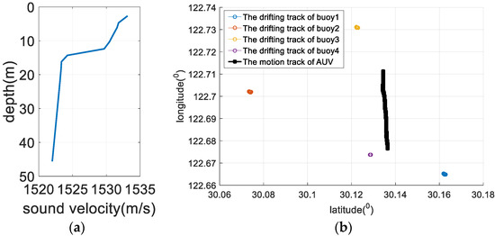 Sea trial conditions. (a) The sea trial sound velocity profile; (b) the movement trajectory of the AUV and the position of the buoy beacons.